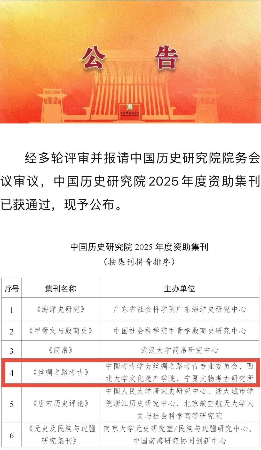日前,中国历史研究院发布了2025年度集刊资助公告,由我校文化遗产学院等单位主办的《丝绸之路考古》等6家集刊入选。中国历史研究院学术性集刊资助项目,面向全国史学研究和教学机构主办的历史学学术性集刊,对坚持历史唯物主义立场、观点、方法,具有较高理论价值和应用价值,体现我国历史学研究水平的学术性集刊予以资助,力求建设高端学术传播平台,打造国际知名、国内一流的学术集刊。每年组织一次立项工作,资助周期为三年。