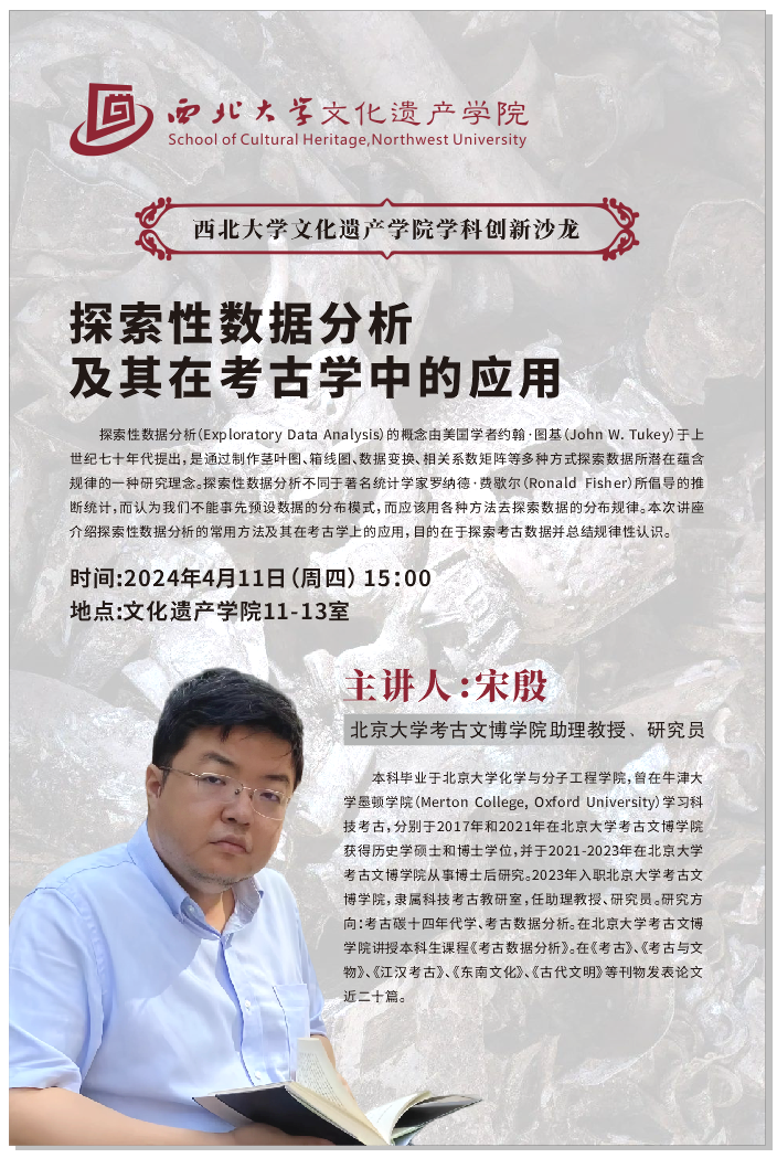 主讲人介绍:宋殷,北京大学考古文博学院助理教授、研究员。本科毕业于北京大学化学与分子工程学院,曾在牛津大学墨顿学院(Merton College, Oxford University)学习科技考古,分别于2017年和2021年在北京大学考古文博学院获得历史学硕士和博士学位,并于2021-2023年在北京大学考古文博学院从事博士后研究。2023年入职北京大学考古文博学院,隶属科技考古教研室,任助理教授、研究员。研究方向:考古碳十四年代学、考古数据分析。在北京大学考古文博学院讲授本科生课程《考古数据分析》。在《考古》、《考古与文物》、《江汉考古》、《东南文化》、《古代文明》等刊物发表论文近二十篇。